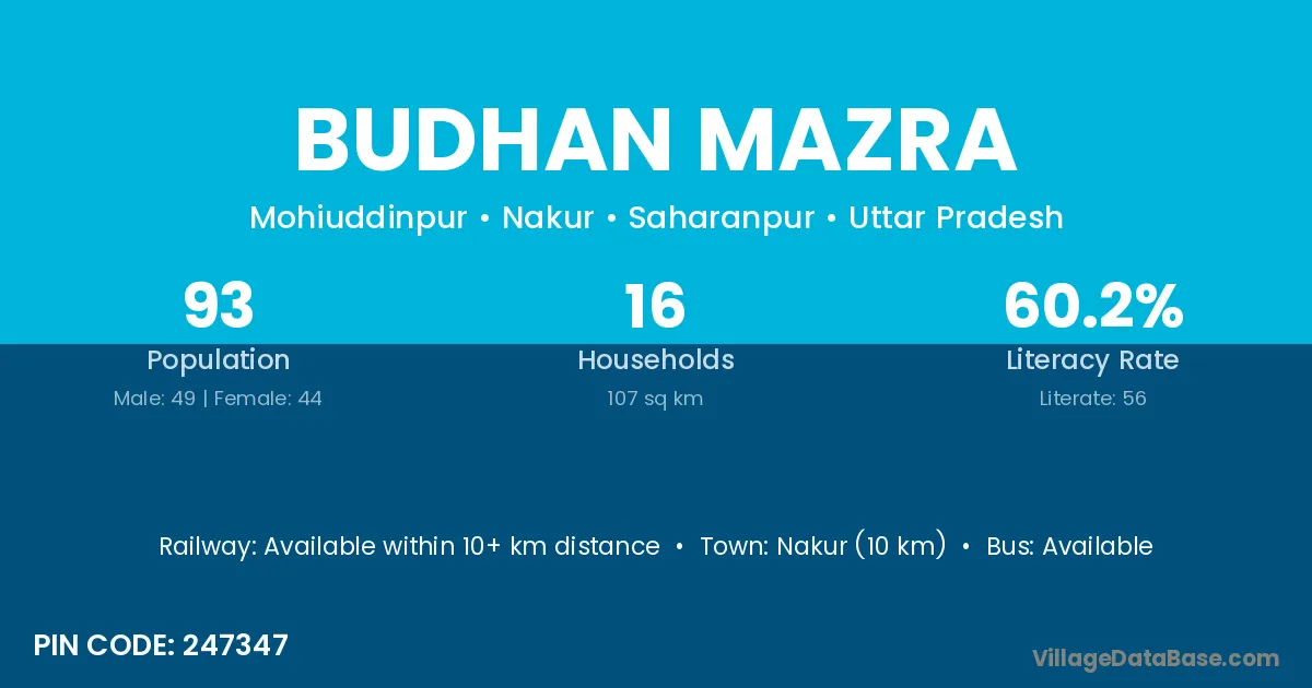 Nakur (10 km) is the nearest town to Budhan Mazra village for major economic activities and is located approximately 10 km away.