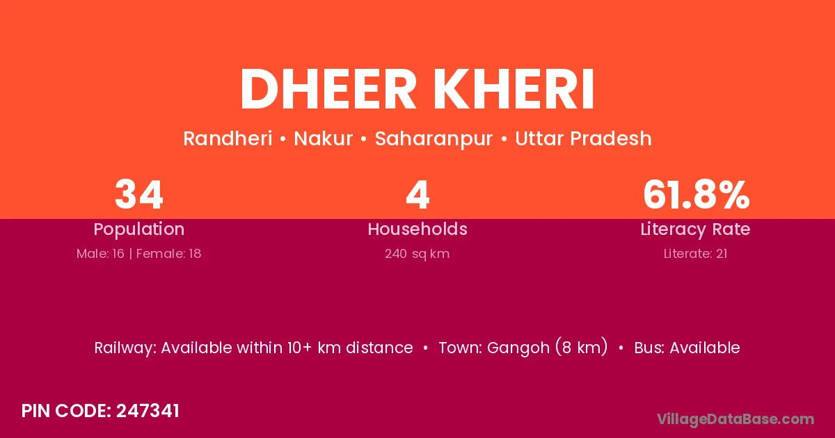 Gangoh (8 km) is the nearest town to Dheer Kheri village for major economic activities and is located approximately 8 km away.