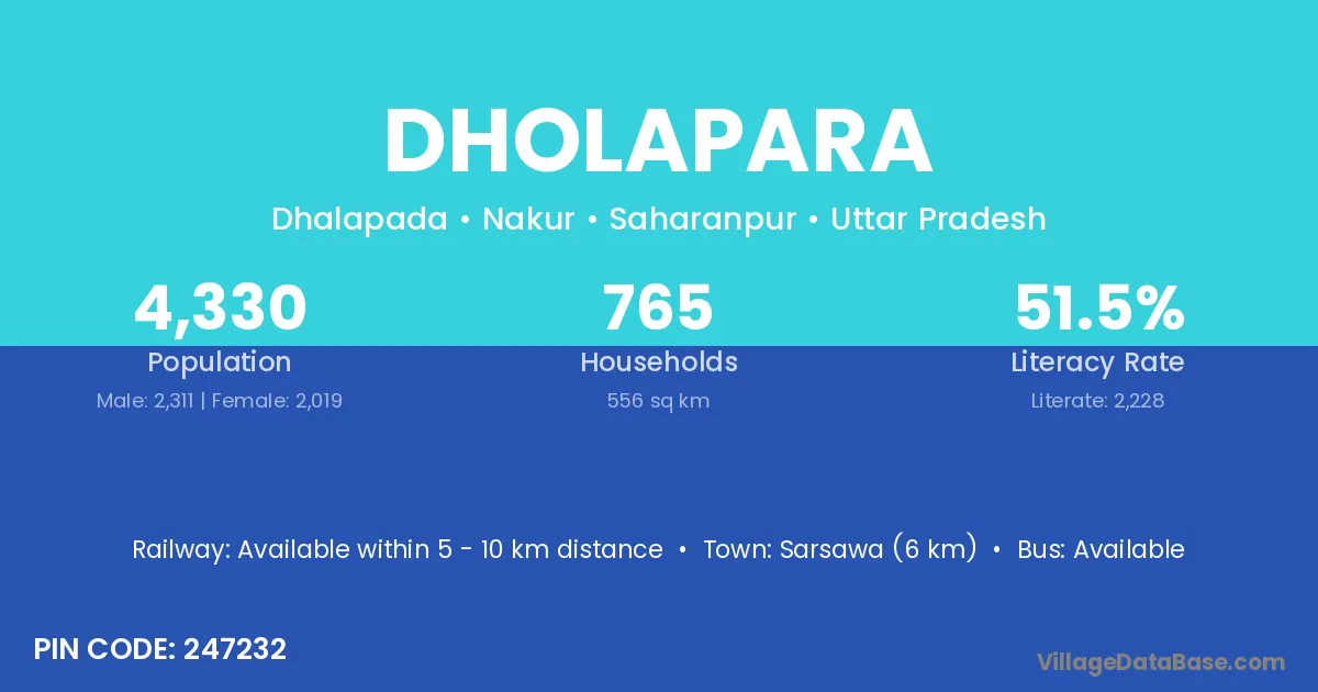 Sarsawa (6 km) is the nearest town to Dholapara village for major economic activities and is located approximately 6 km away.