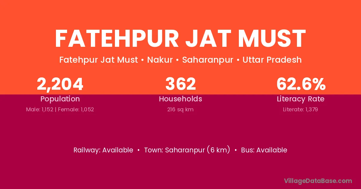 Saharanpur (6 km) is the nearest town to Fatehpur Jat Must village for major economic activities and is located approximately 6 km away.