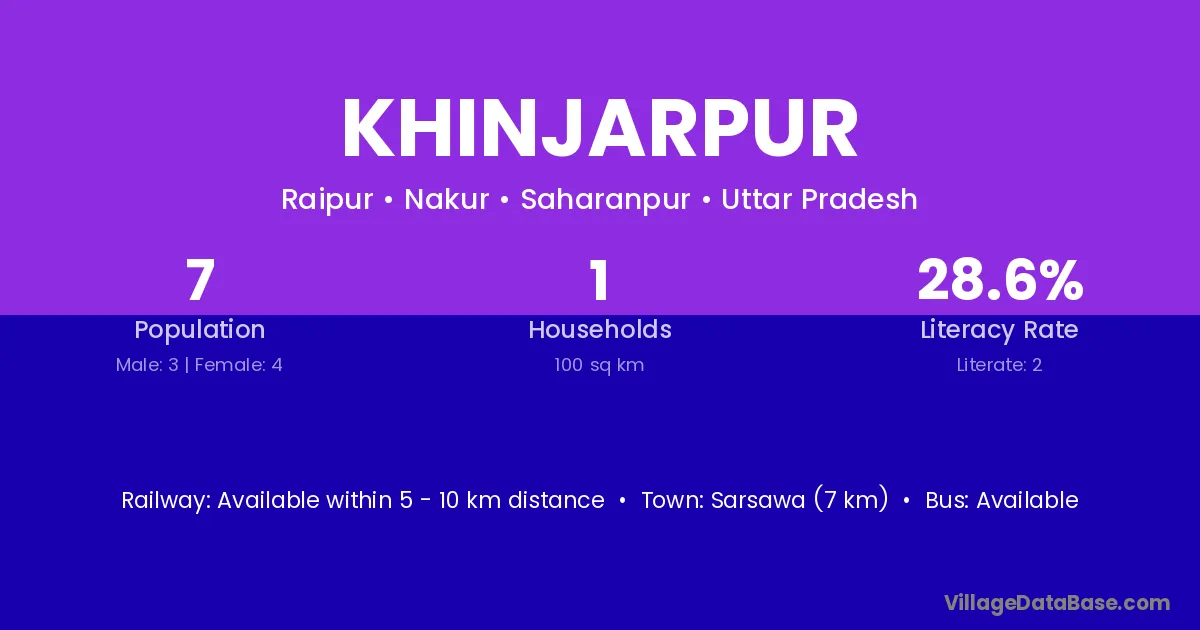 Sarsawa (7 km) is the nearest town to Khinjarpur village for major economic activities and is located approximately 7 km away.