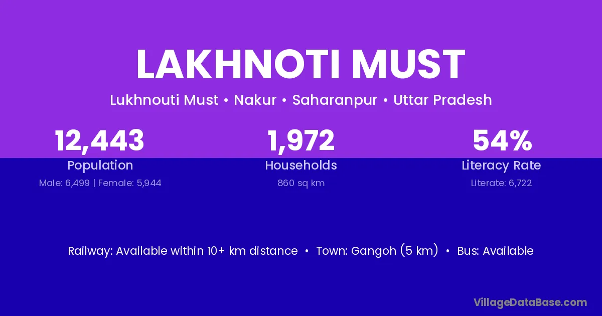 Gangoh (5 km) is the nearest town to Lakhnoti Must village for major economic activities and is located approximately 5 km away.