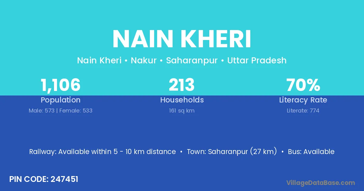 Saharanpur (27 km) is the nearest town to Nain Kheri village for major economic activities and is located approximately 27 km away.
