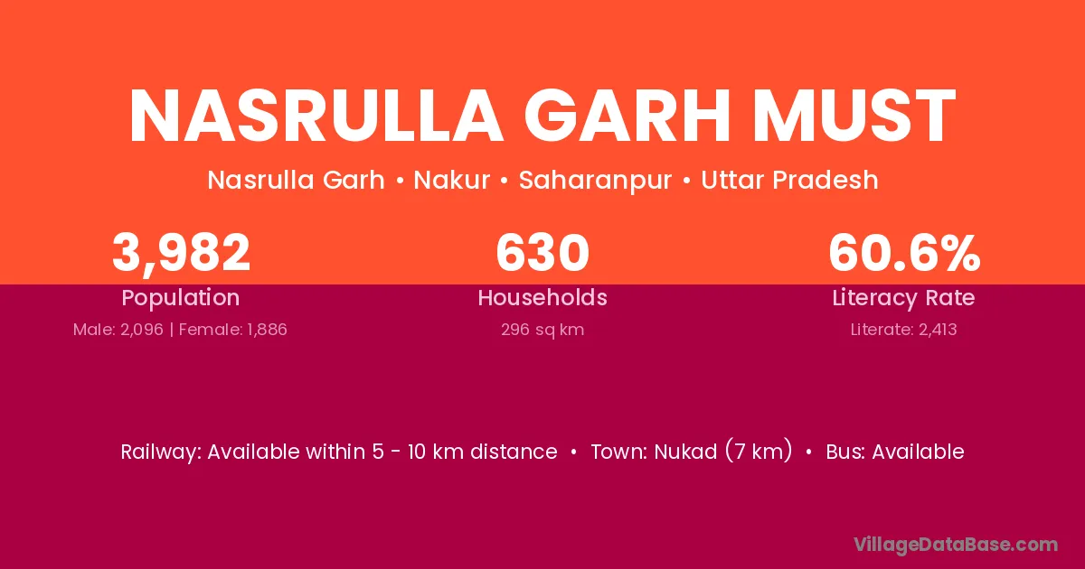 Nukad (7 km) is the nearest town to Nasrulla Garh Must village for major economic activities and is located approximately 7 km away.