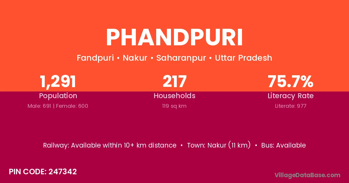 Nakur (11 km) is the nearest town to Phandpuri village for major economic activities and is located approximately 11 km away.