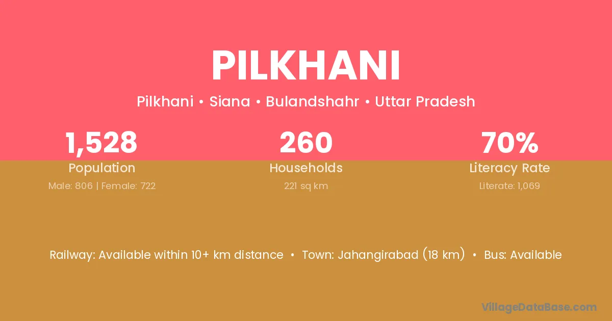 The literacy rate of Pilkhani village is 64.72%. Male literacy stands at 72.58% and female literacy at 56.04%.