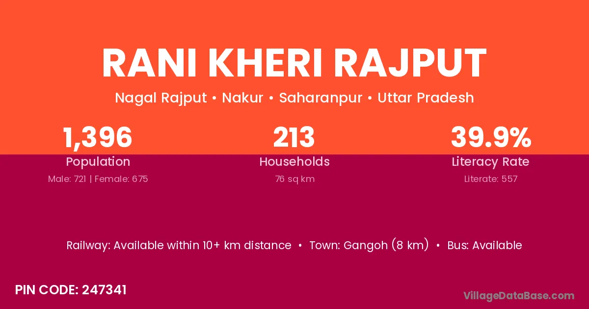 Gangoh (8 km) is the nearest town to Rani Kheri Rajput village for major economic activities and is located approximately 8 km away.