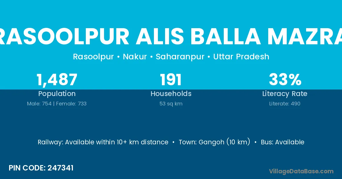 Gangoh (10 km) is the nearest town to Rasoolpur Alis Balla Mazra village for major economic activities and is located approximately 10 km away.