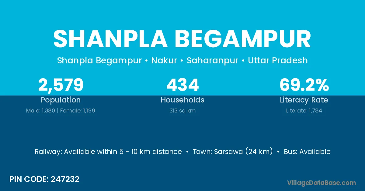 Sarsawa (24 km) is the nearest town to Shanpla Begampur village for major economic activities and is located approximately 24 km away.