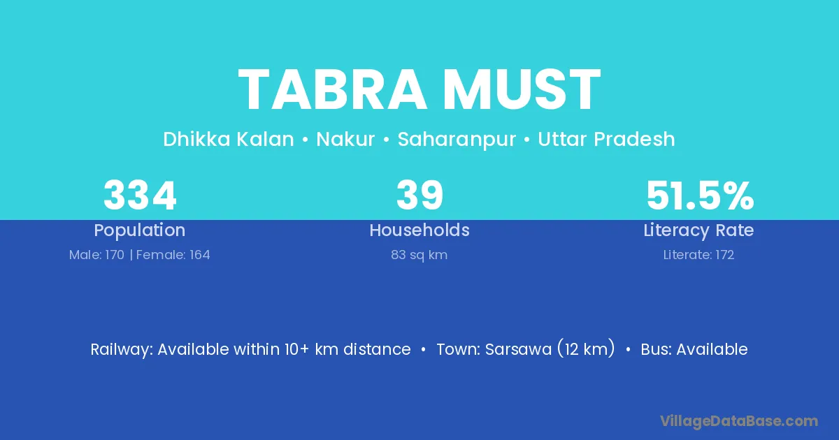 Sarsawa (12 km) is the nearest town to Tabra Must village for major economic activities and is located approximately 12 km away.