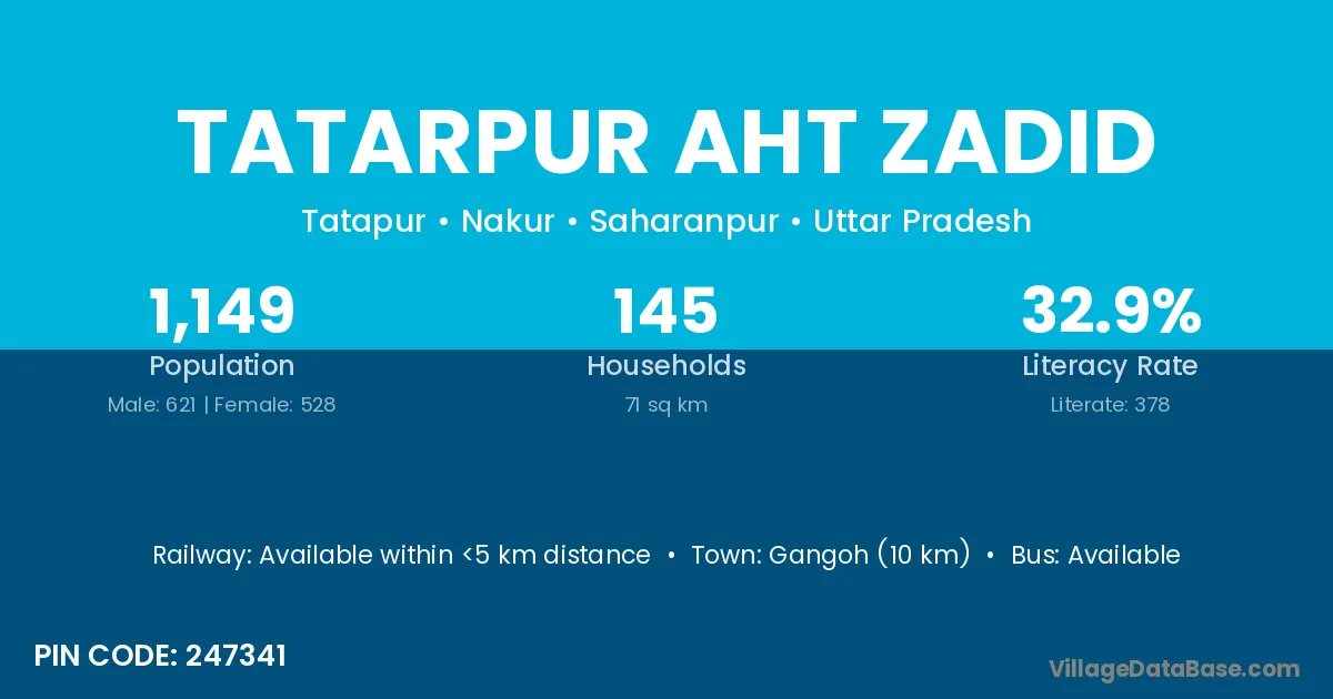 Gangoh (10 km) is the nearest town to Tatarpur Aht Zadid village for major economic activities and is located approximately 10 km away.