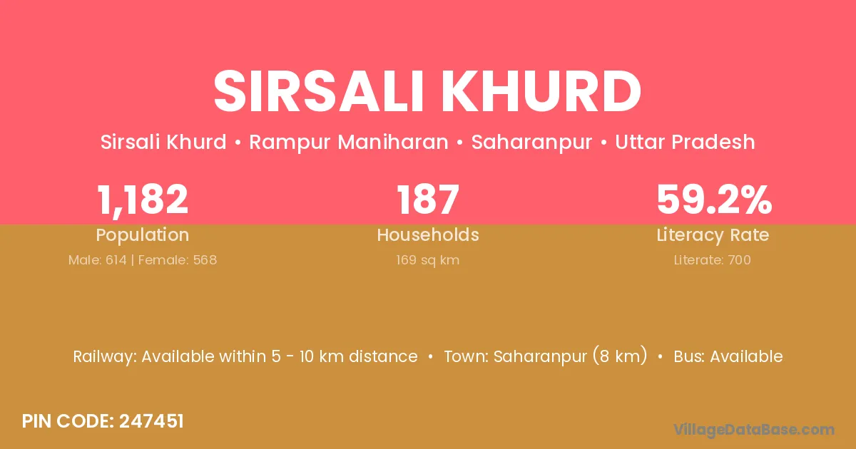 Sirsali Khurd village has a total population of 1,182 people, of which 614 are males and 568 are females.