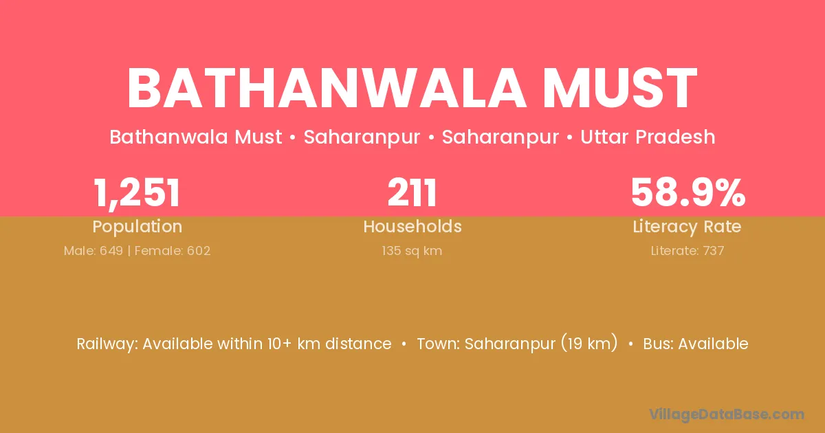 Saharanpur (19 km) is the nearest town to Bathanwala Must village for major economic activities and is located approximately 19 km away.