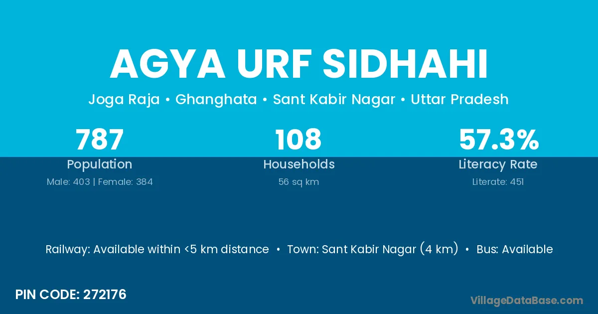 Sant Kabir Nagar (4 km) is the nearest town to Agya Urf Sidhahi village for major economic activities and is located approximately 4 km away.