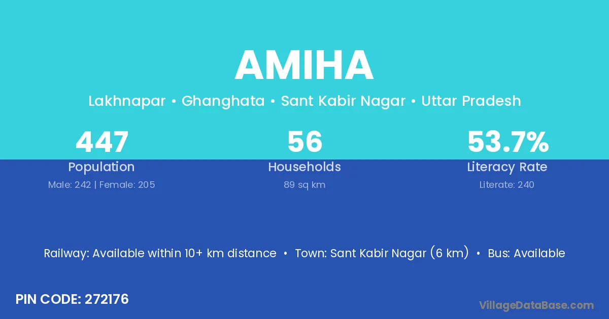 Sant Kabir Nagar (6 km) is the nearest town to Amiha village for major economic activities and is located approximately 6 km away.
