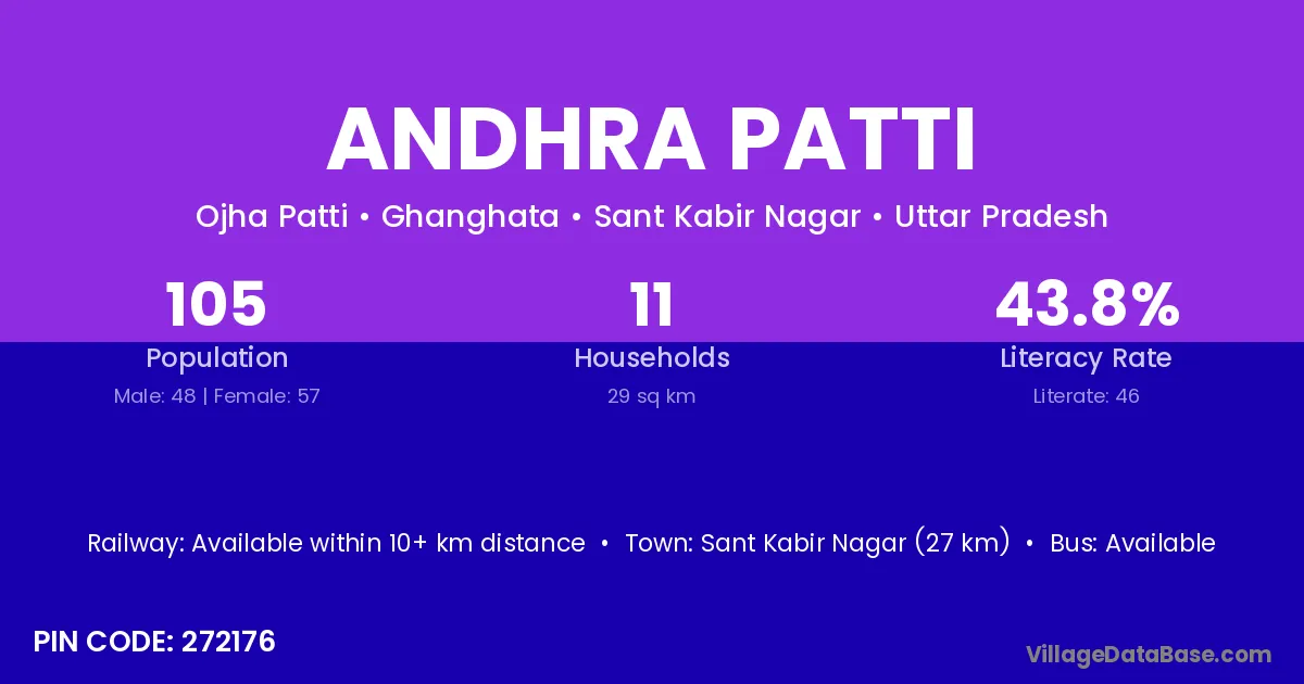 Sant Kabir Nagar (27 km) is the nearest town to Andhra Patti village for major economic activities and is located approximately 27 km away.
