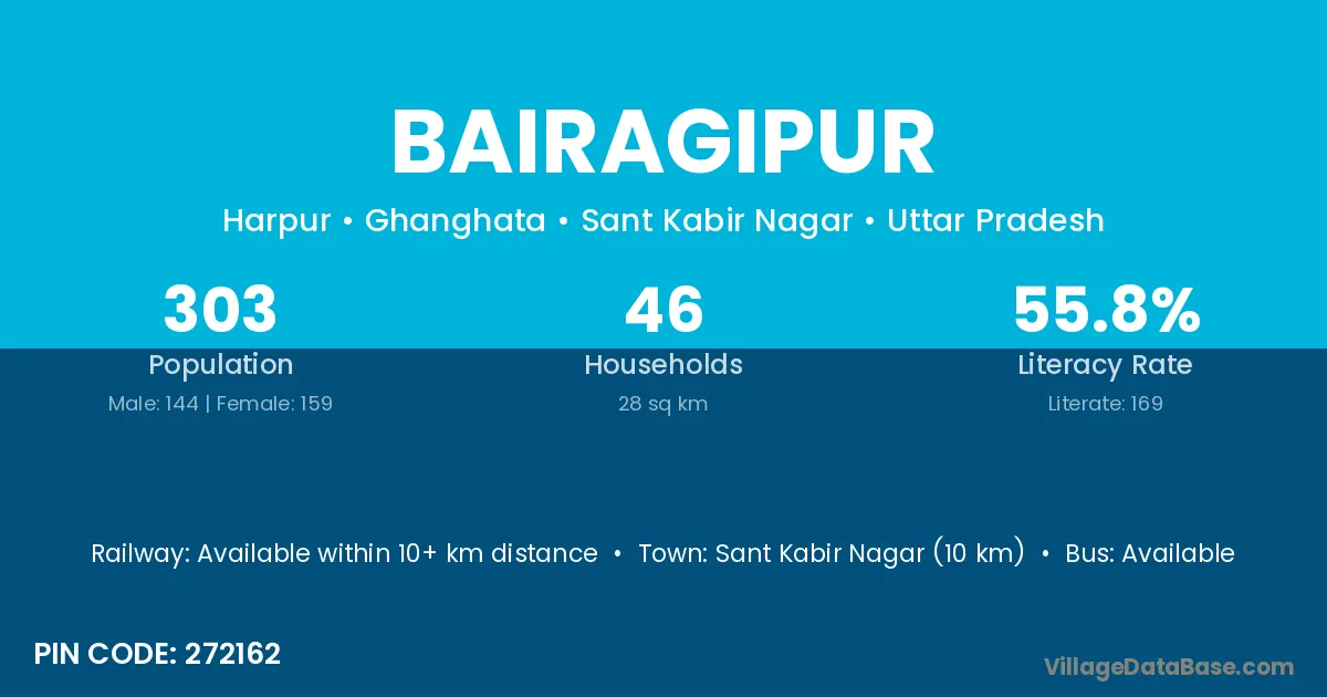 Sant Kabir Nagar (10 km) is the nearest town to Bairagipur village for major economic activities and is located approximately 10 km away.
