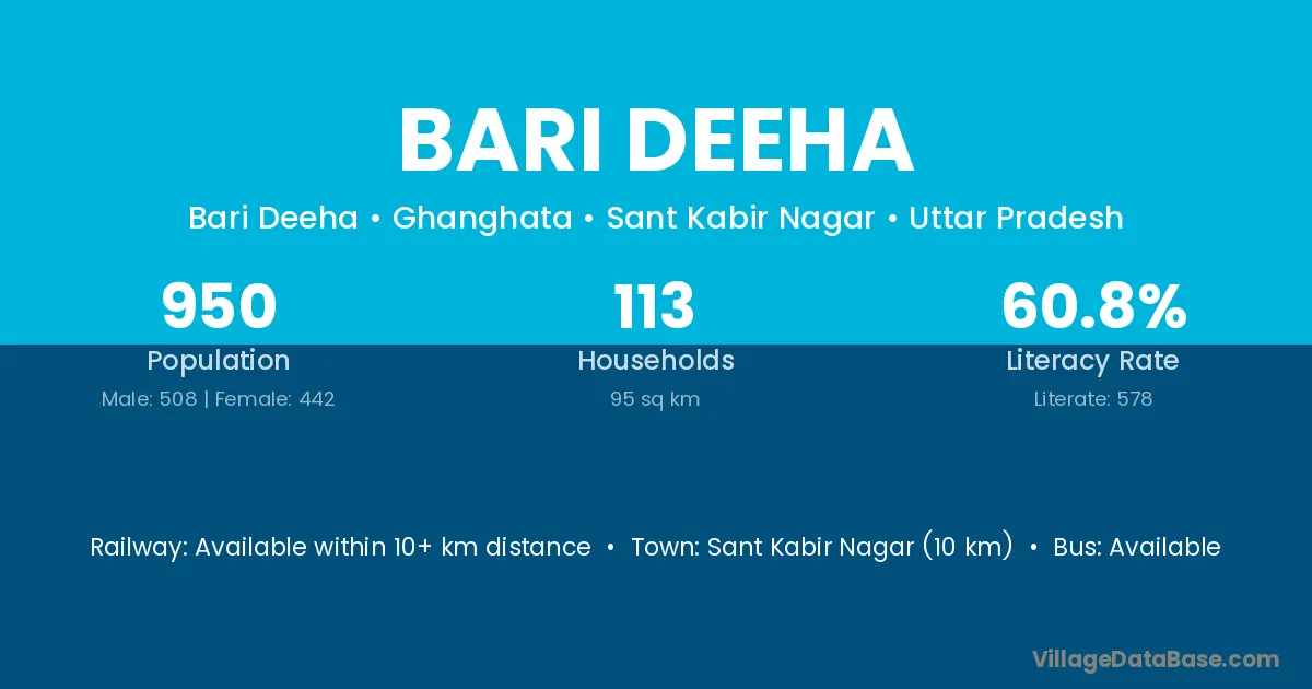 Sant Kabir Nagar (10 km) is the nearest town to Bari Deeha village for major economic activities and is located approximately 10 km away.