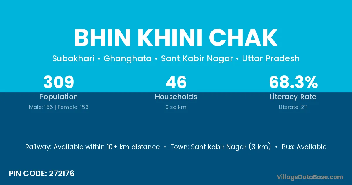 Sant Kabir Nagar (3 km) is the nearest town to Bhin Khini Chak village for major economic activities and is located approximately 3 km away.