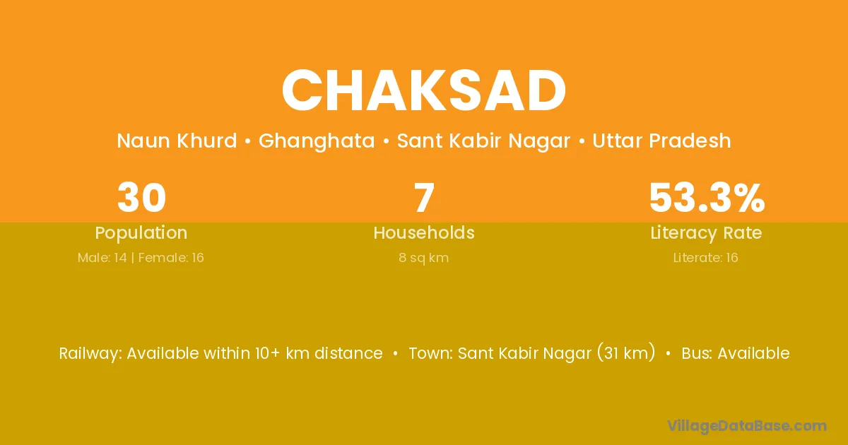 Sant Kabir Nagar (31 km) is the nearest town to Chaksad village for major economic activities and is located approximately 31 km away.