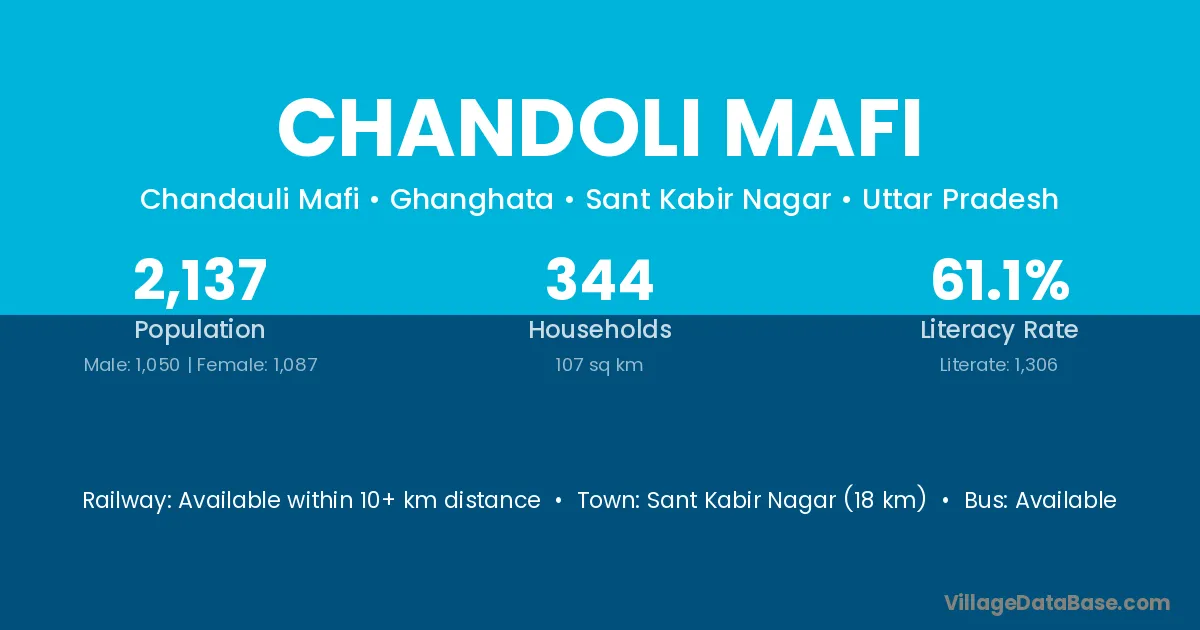 Sant Kabir Nagar (18 km) is the nearest town to Chandoli Mafi village for major economic activities and is located approximately 18 km away.