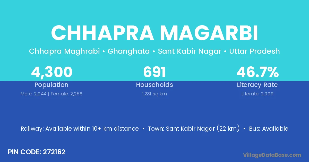 Sant Kabir Nagar (22 km) is the nearest town to Chhapra Magarbi village for major economic activities and is located approximately 22 km away.