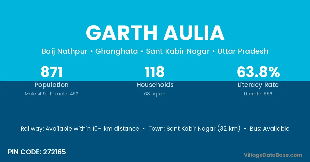 Sant Kabir Nagar (32 km) is the nearest town to Garth Aulia village for major economic activities and is located approximately 32 km away.