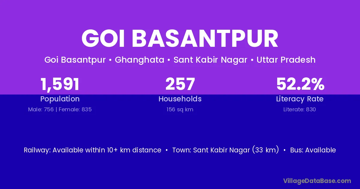 Sant Kabir Nagar (33 km) is the nearest town to Goi Basantpur village for major economic activities and is located approximately 33 km away.