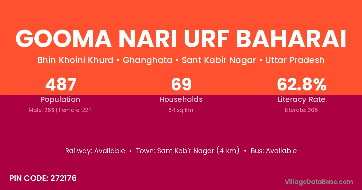 Sant Kabir Nagar (4 km) is the nearest town to Gooma Nari Urf Baharai village for major economic activities and is located approximately 4 km away.