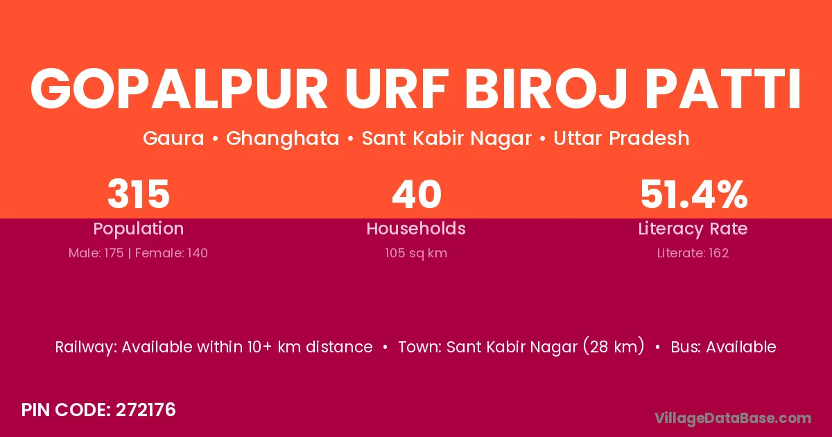 Sant Kabir Nagar (28 km) is the nearest town to Gopalpur Urf Biroj Patti village for major economic activities and is located approximately 28 km away.