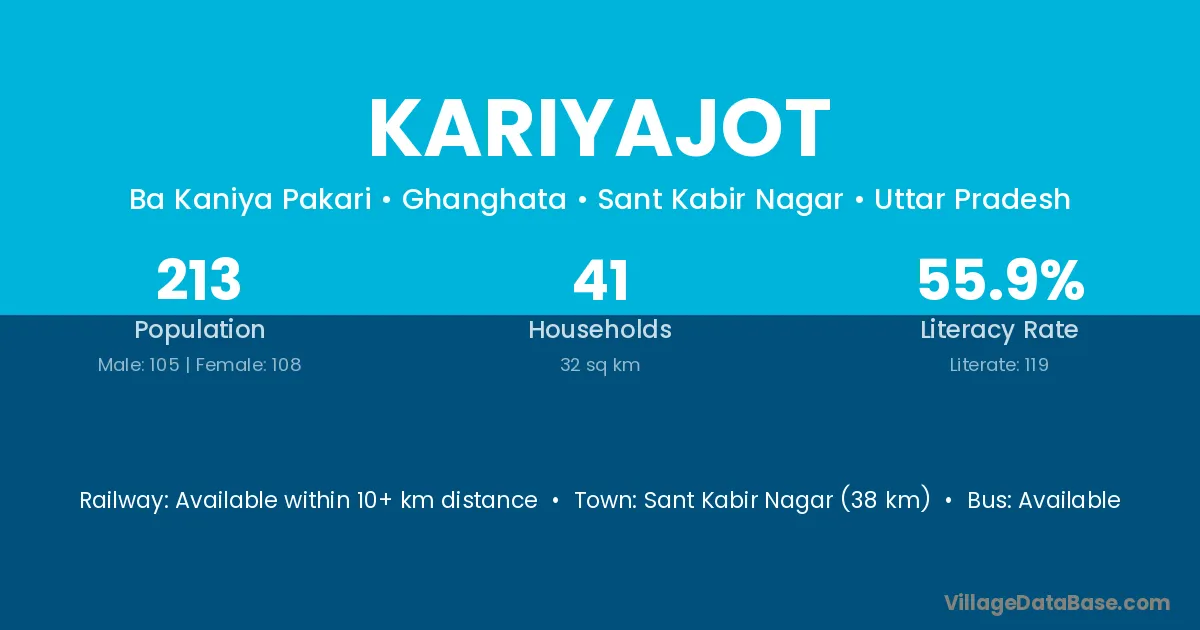 Sant Kabir Nagar (38 km) is the nearest town to Kariyajot village for major economic activities and is located approximately 38 km away.