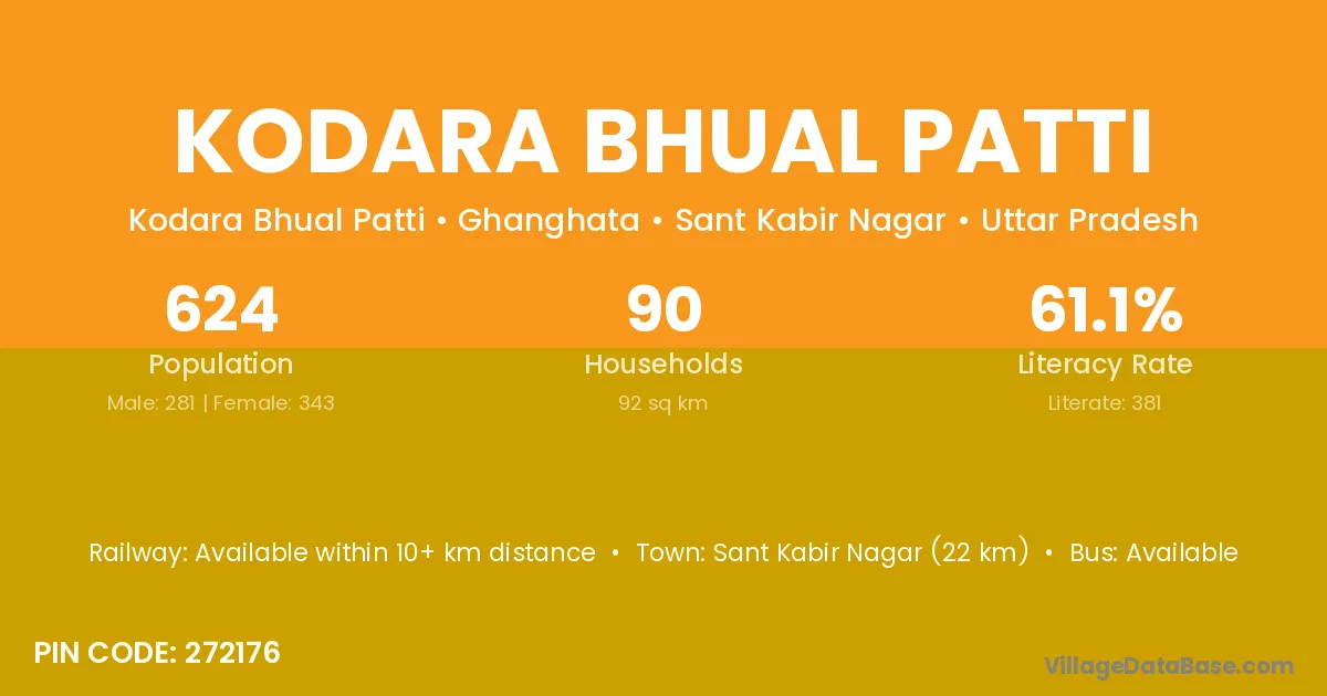 Sant Kabir Nagar (22 km) is the nearest town to Kodara Bhual Patti village for major economic activities and is located approximately 22 km away.