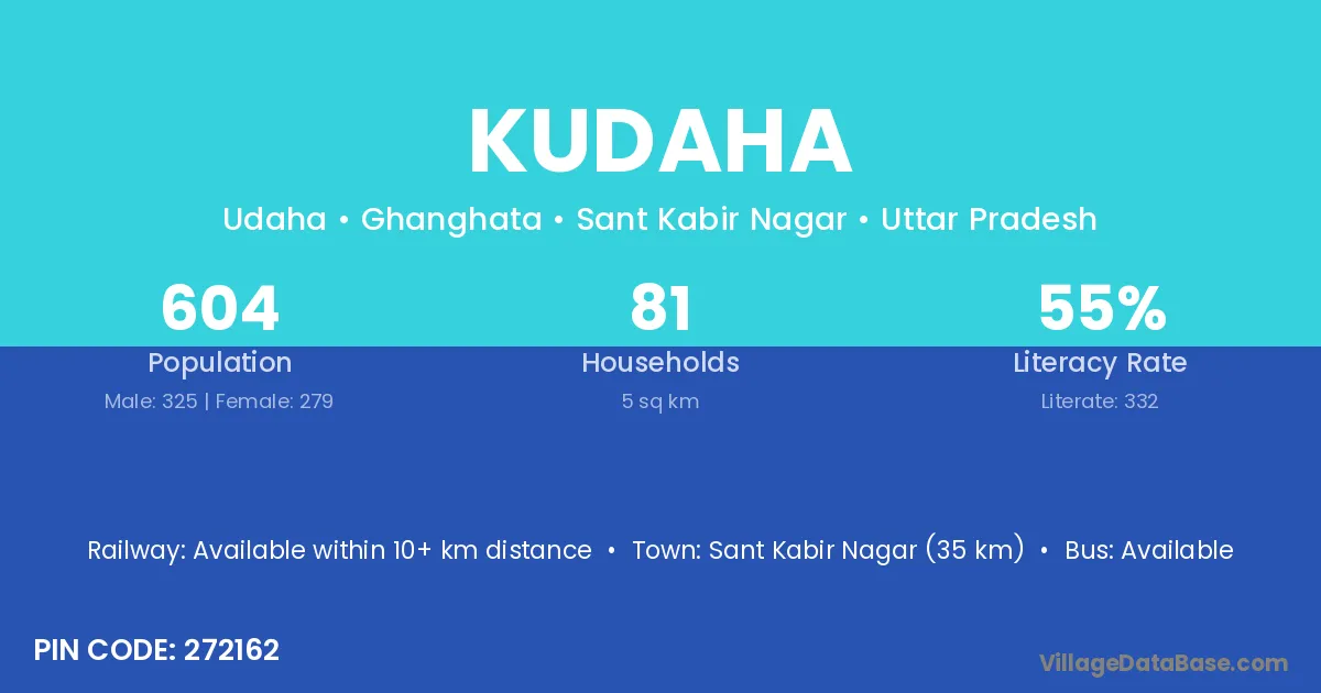 Sant Kabir Nagar (35 km) is the nearest town to Kudaha village for major economic activities and is located approximately 35 km away.