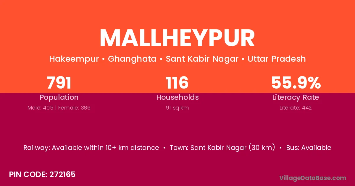 Sant Kabir Nagar (30 km) is the nearest town to Mallheypur village for major economic activities and is located approximately 30 km away.