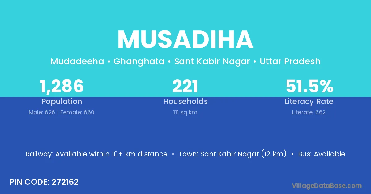 Sant Kabir Nagar (12 km) is the nearest town to Musadiha village for major economic activities and is located approximately 12 km away.