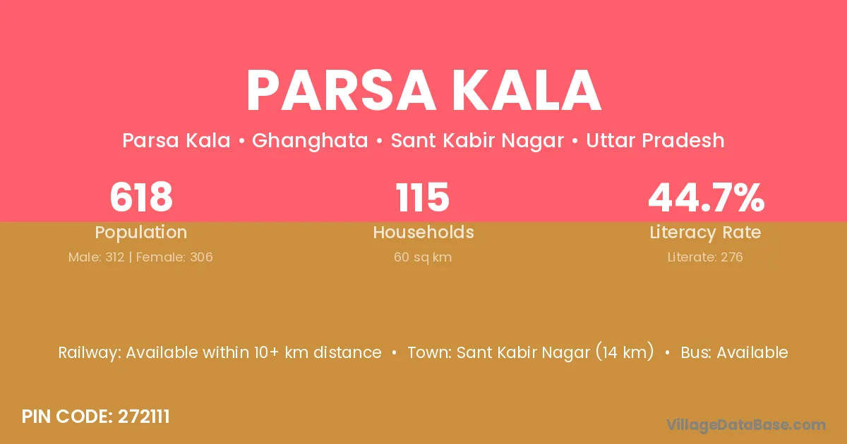 Sant Kabir Nagar (14 km) is the nearest town to Parsa Kala village for major economic activities and is located approximately 14 km away.
