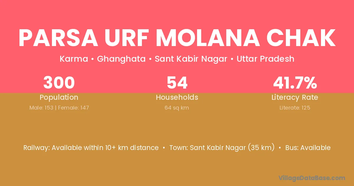 Sant Kabir Nagar (35 km) is the nearest town to Parsa Urf Molana Chak village for major economic activities and is located approximately 35 km away.