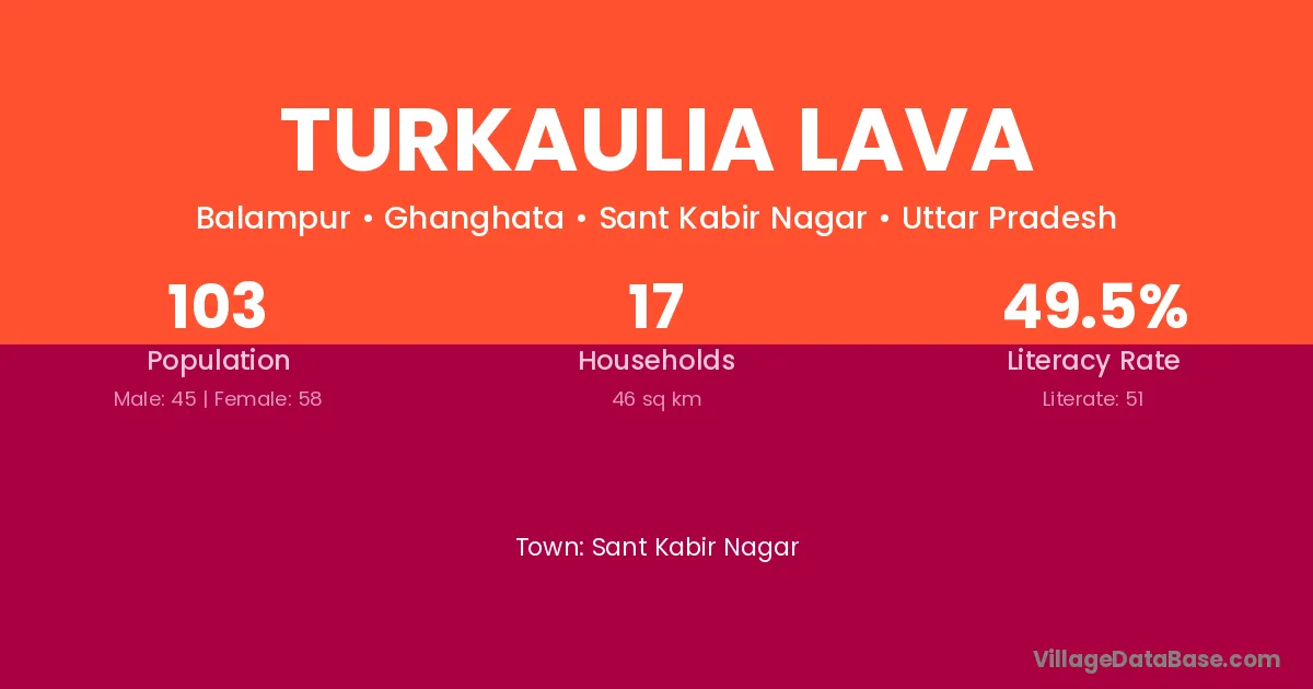 Turkaulia Lava village has a total population of 103 people, of which 45 are males and 58 are females.