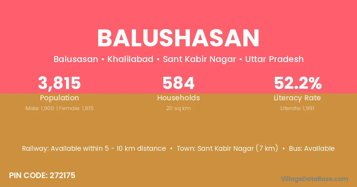 Sant Kabir Nagar (7 km) is the nearest town to Balushasan village for major economic activities and is located approximately 7 km away.
