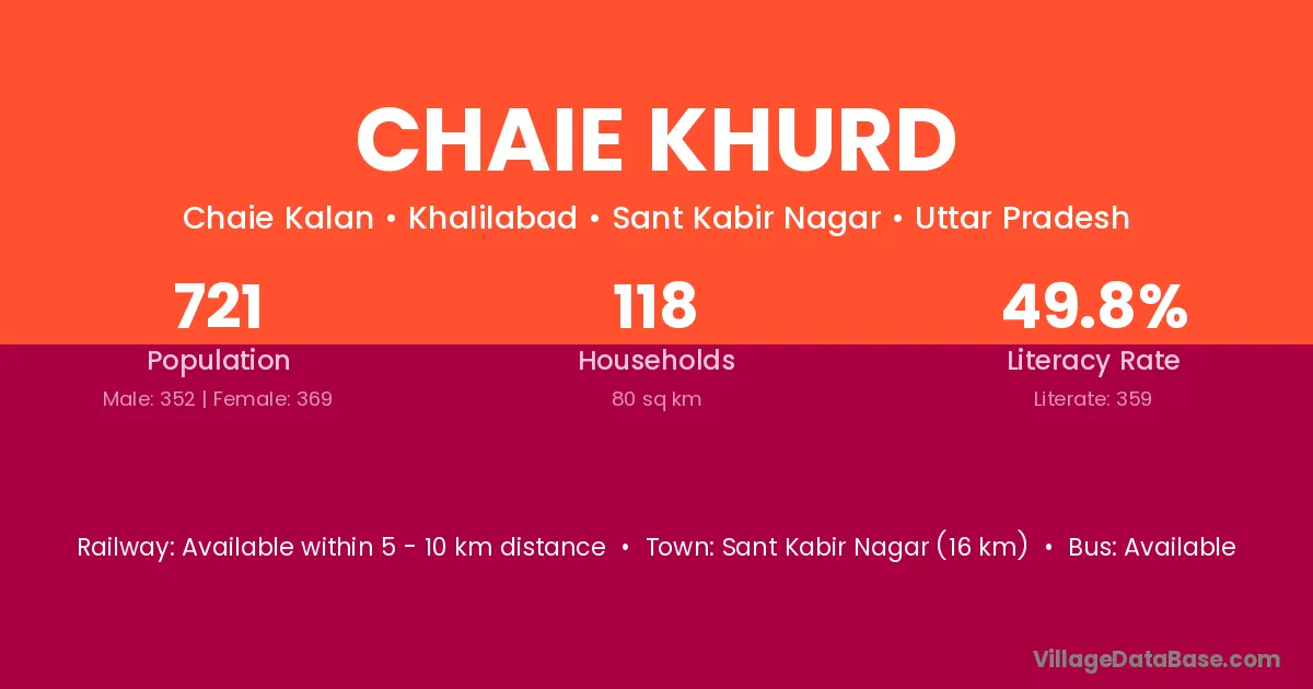 Sant Kabir Nagar (16 km) is the nearest town to Chaie Khurd village for major economic activities and is located approximately 16 km away.