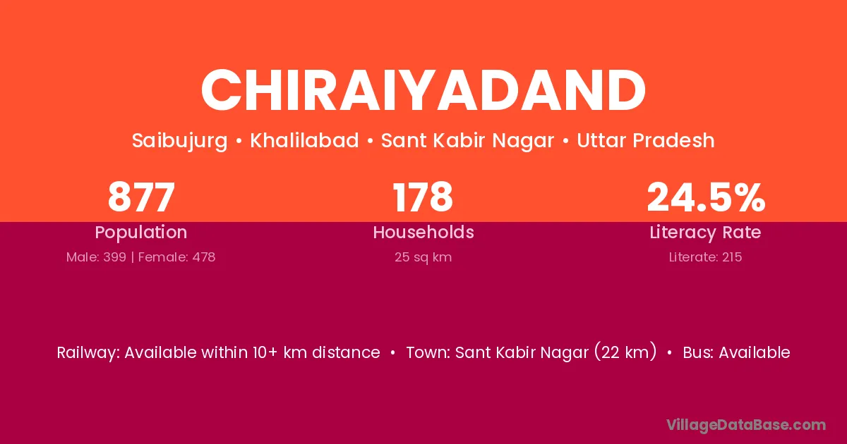 Sant Kabir Nagar (22 km) is the nearest town to Chiraiyadand village for major economic activities and is located approximately 22 km away.