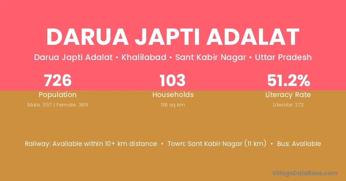 Sant Kabir Nagar (11 km) is the nearest town to Darua Japti Adalat village for major economic activities and is located approximately 11 km away.