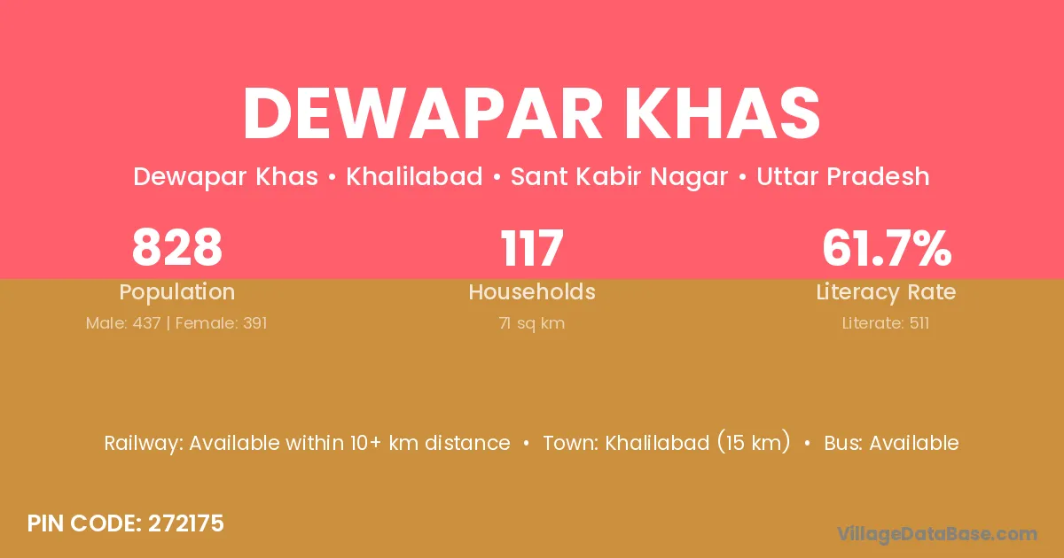Khalilabad (15 km) is the nearest town to Dewapar Khas village for major economic activities and is located approximately 15 km away.