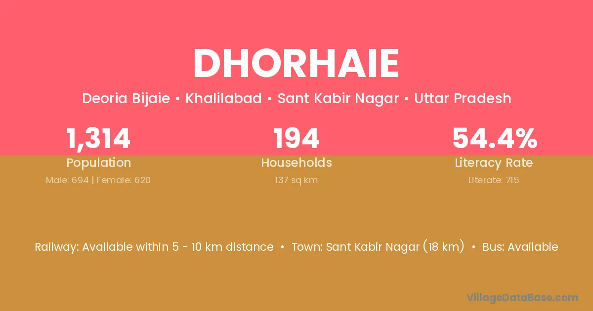 Sant Kabir Nagar (18 km) is the nearest town to Dhorhaie village for major economic activities and is located approximately 18 km away.