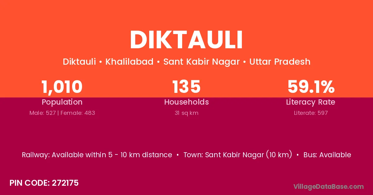 Sant Kabir Nagar (10 km) is the nearest town to Diktauli village for major economic activities and is located approximately 10 km away.