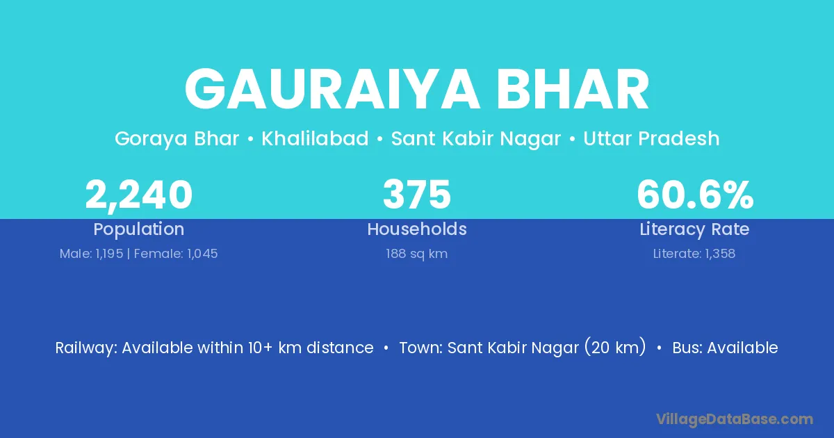 Sant Kabir Nagar (20 km) is the nearest town to Gauraiya Bhar village for major economic activities and is located approximately 20 km away.