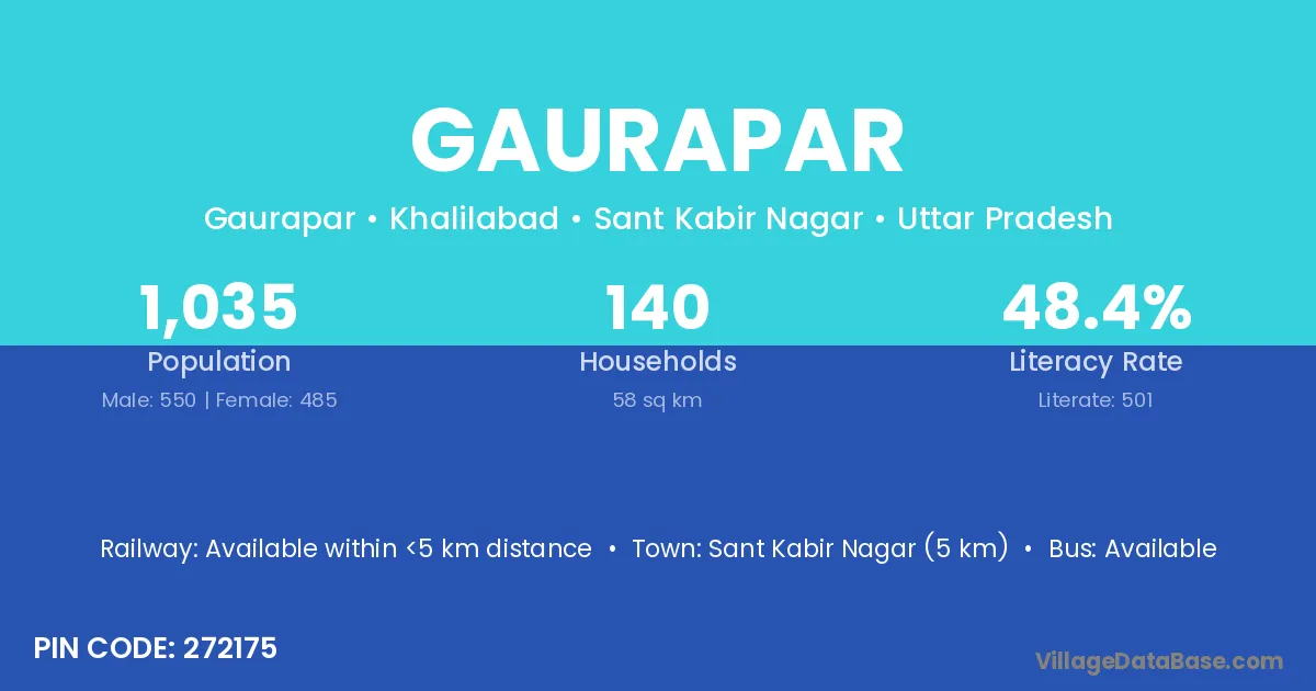 Sant Kabir Nagar (5 km) is the nearest town to Gaurapar village for major economic activities and is located approximately 5 km away.