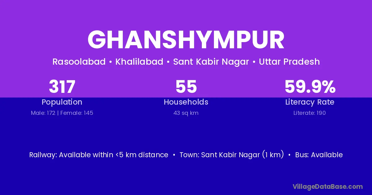 Sant Kabir Nagar (1 km) is the nearest town to Ghanshympur village for major economic activities and is located approximately 1 km away.