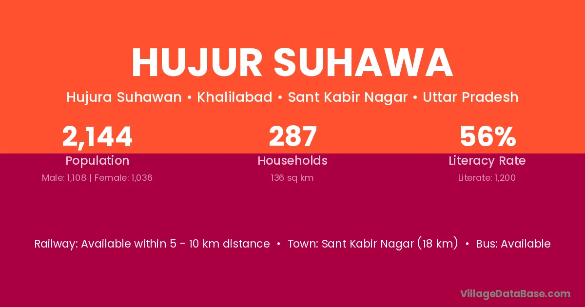 Sant Kabir Nagar (18 km) is the nearest town to Hujur Suhawa village for major economic activities and is located approximately 18 km away.