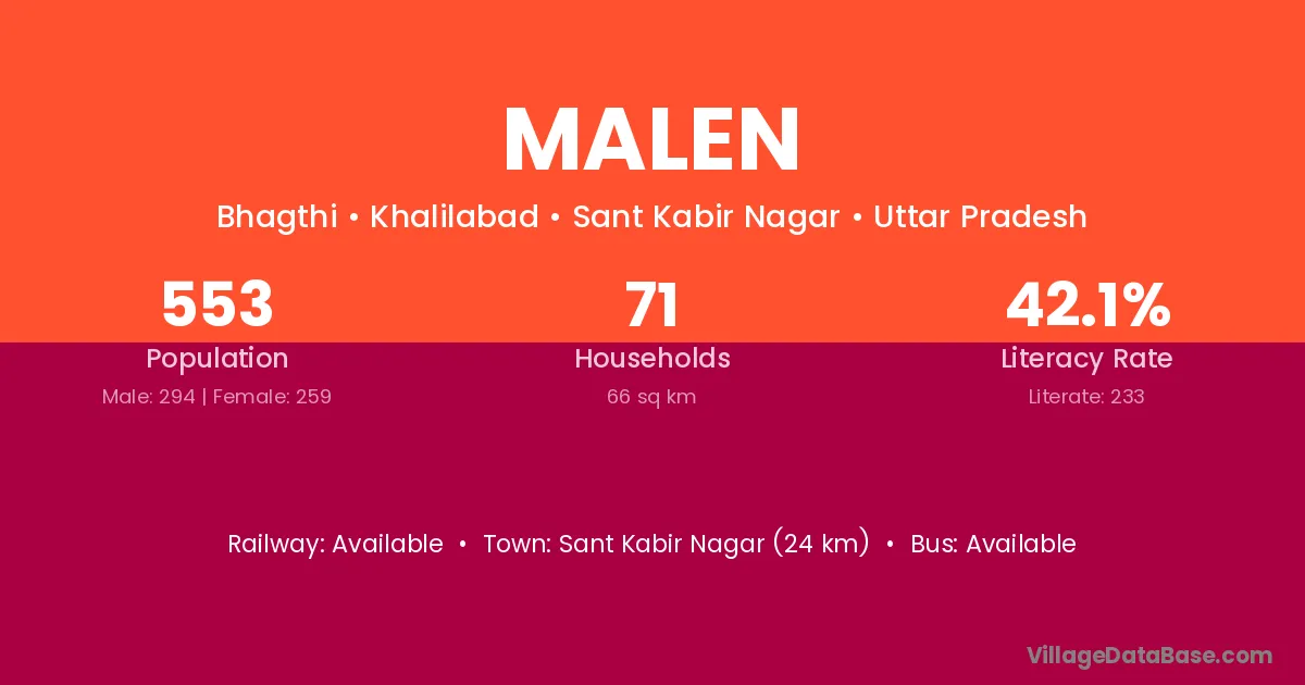 Sant Kabir Nagar (24 km) is the nearest town to Malen village for major economic activities and is located approximately 24 km away.